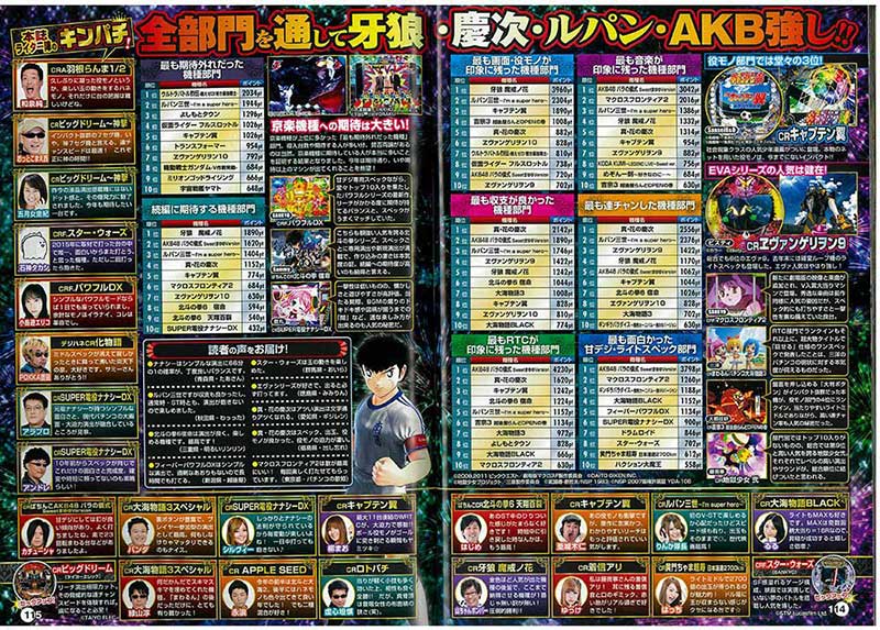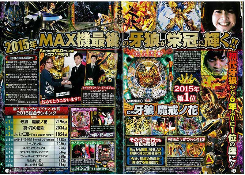 見事大賞を獲得した「牙狼 魔戒ノ花」だが、部門賞では意外に苦戦。その代わりに票を獲得したのは前年覇者「AKB48 バラの儀式」の甘デジである「まゆゆver.」! スペックが変わってもやはり「AKB48」は強いと再確認させられました。また「連チャン」「収支」といった部門では「真・慶次」がしっかり首位をキープ。「頑張ったメーカー」では「SanseiR&D」が初戴冠となっています。