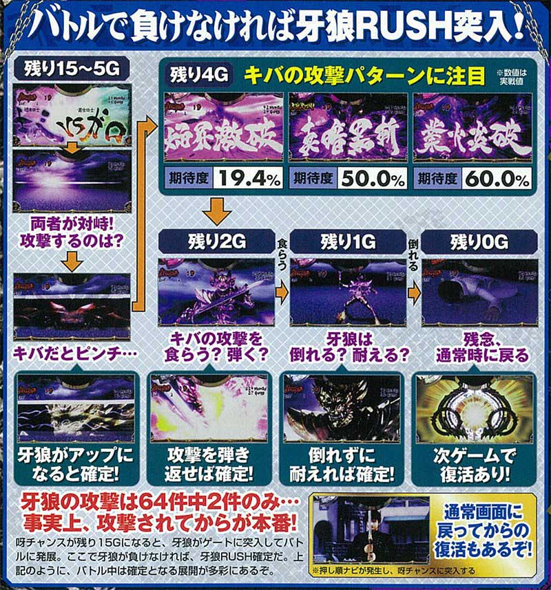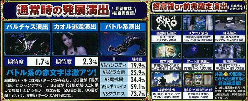 通常時の演出はバトル系がメイン。いくつかのチャンスアップ演出も存在し、これらが成功すれば牙狼RUSH突入抽選である「呀チャンス」か擬似ボーナス「魔戒ボーナス」へ。「呀チャンス」は最終的に呀バトルが発生。ここで勝利すれば待望の牙狼RUSHへと突入しました。