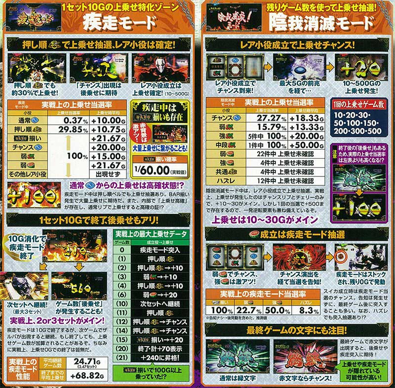 ちなみにART中は1Gあたり約2.0枚の増加。最高ループ率は約92%となっており、「陰我消滅モード」から上乗せ特化ゾーンである「疾走モード」へ突入できれば一撃も期待できる仕様となっていました。