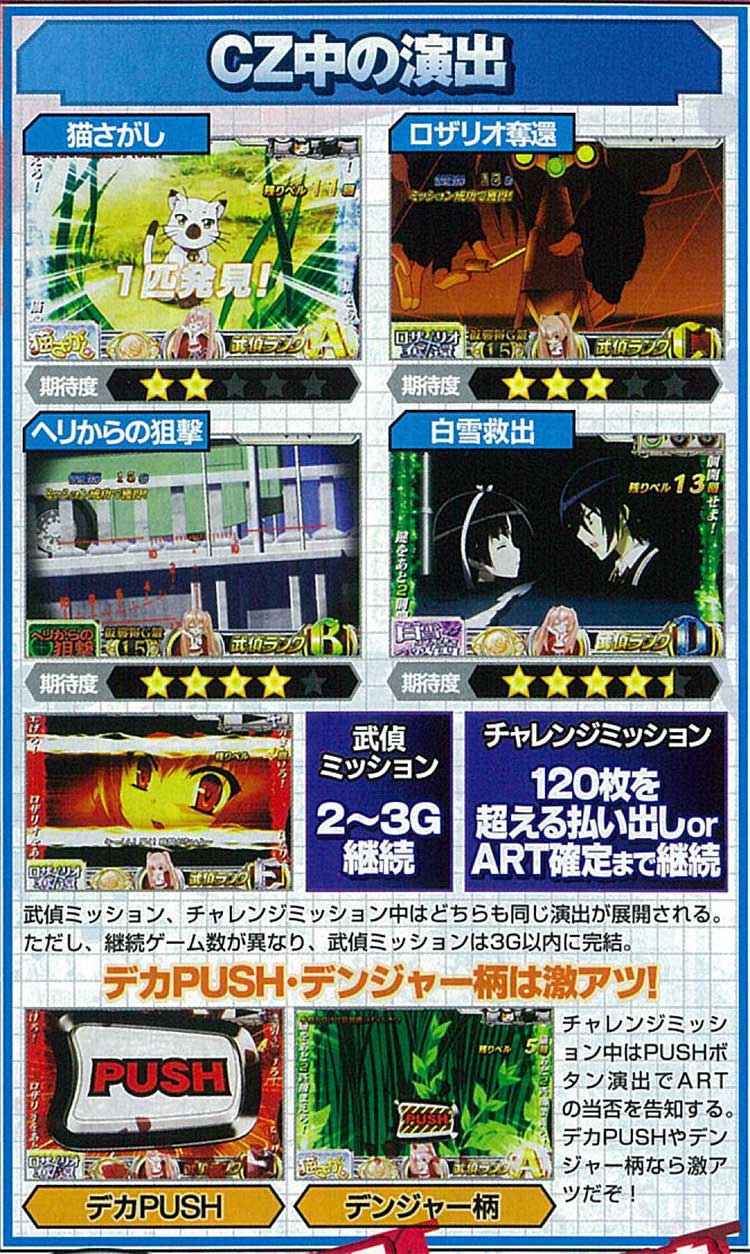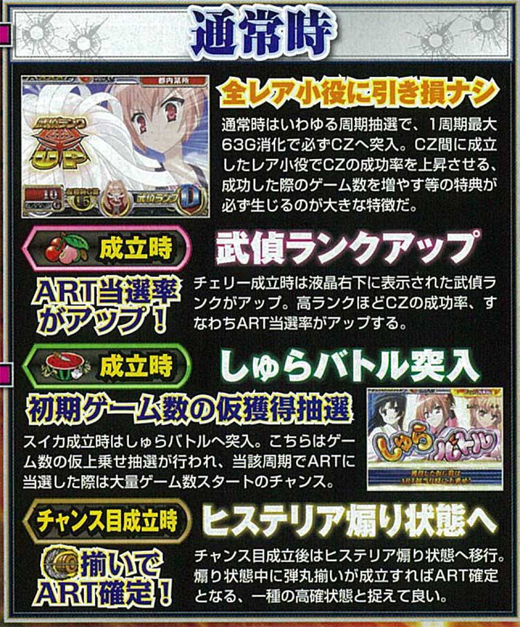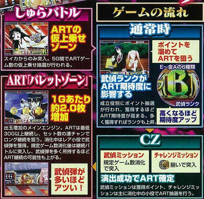 本機は5号機のARTタイプで、周期+ランクで出玉を獲得していくゲーム性。基本的には通常時から2つのCZ「武偵ミッション」「チャレンジミッション」を経由してARTに突入、最大63Gで必ずCZに突入する仕様となっていました。