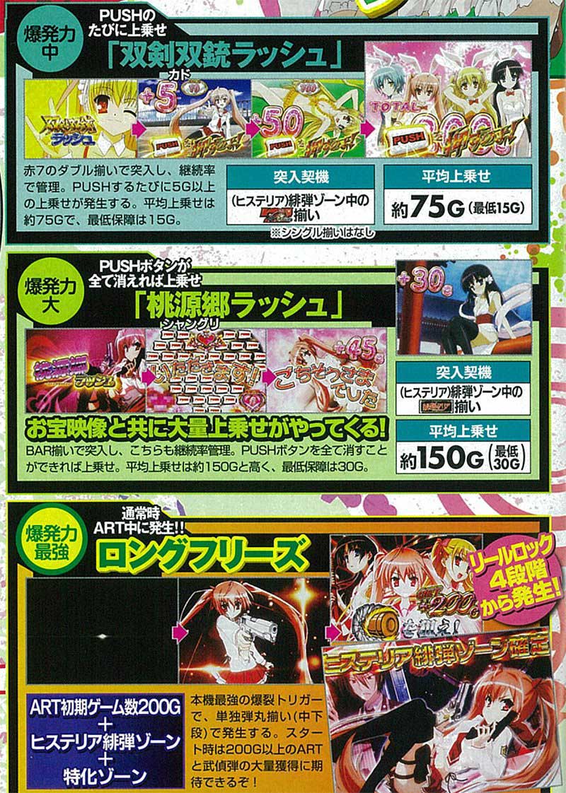 通常時はチェリー・スイカ・チャンス目当選それぞれでその後の展開が変化。要注目はチャンス目成立時で、成立後はヒステリア煽り状態に突入。ここで弾丸揃いが成立すればART突入確定となりました。