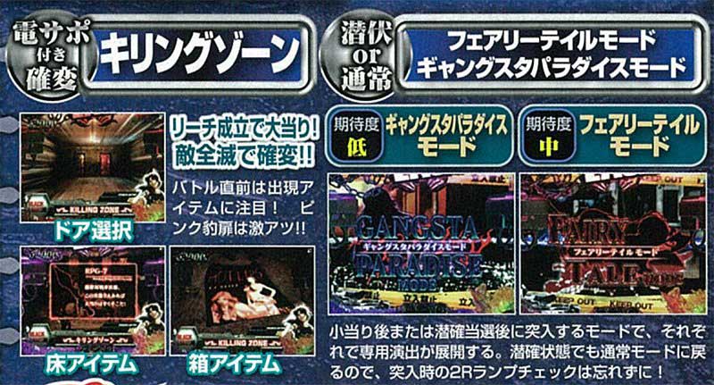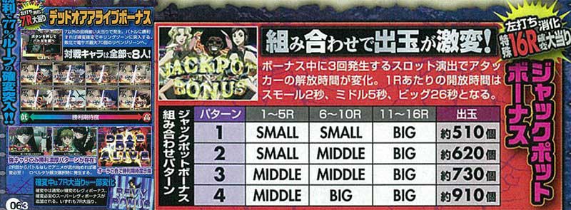 初当りの基本は確変継続を賭けたラウンドバトルが発生するデッドオアアライブボーナス(7R)。対戦キャラは全8人用意されており、それぞれで確変期待度が変化、バトル中にアニメが流れる勝利濃厚パターンも存在しました。