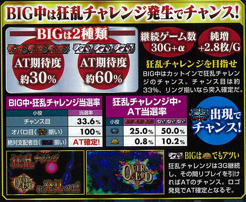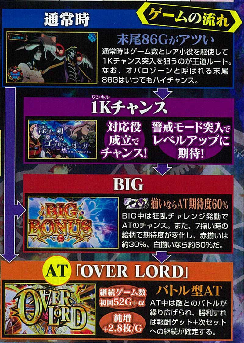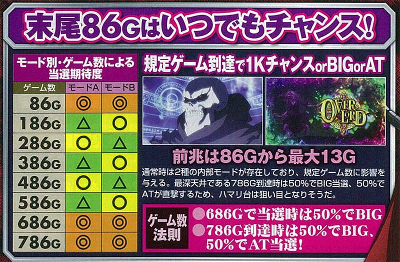2019年8月に登場した本機は、6号機のATタイプ。約50Gに1回AT到達のチャンスが訪れる仕様で、「086(オバロ)」に関連するゲーム数は、AT契機である「1Kチャンス」突入のチャンスとなりました。