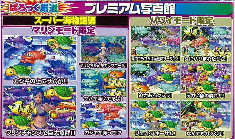初代スパ海のモードは「海」「マリン」「ハワイ」の3種類。舞台に地名が入ったのも、マリンちゃんが主役のモードが搭載されたのも本機が初めてでした。