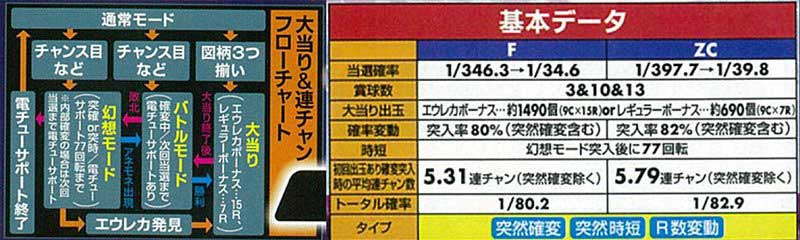 スペックは上記の通り2種類で(後に甘デジも登場)、基本はハイミドルタイプ。複雑なモード移行などはないものの、突然確変&突然時短が搭載されていました。