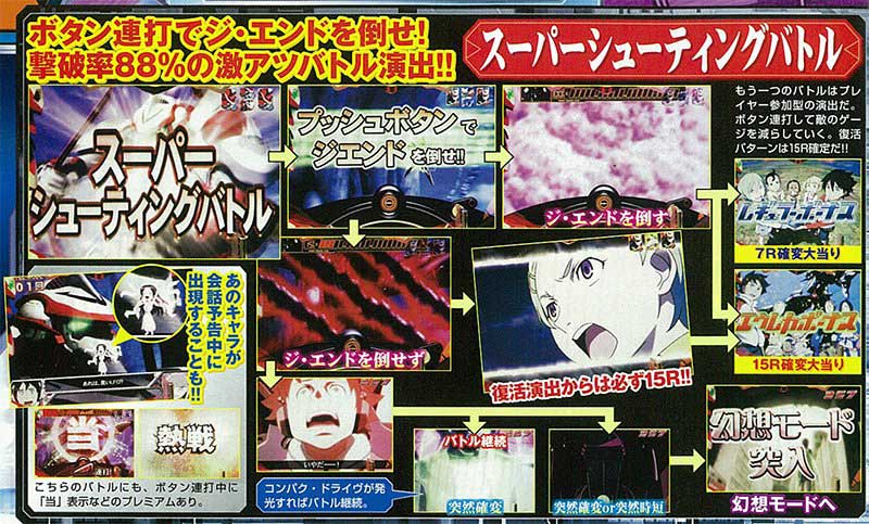 「ニルヴァーシュバトル」は通常のバトル演出となっており、途中で発生するチャンスアップなどで信頼度が変化。敵に勝利すれば大当りに。一方、「スーパーシューティングバトル」はプレイヤー参加型となっており、ボタン連打で敵を撃破すれば大当たとなりました。