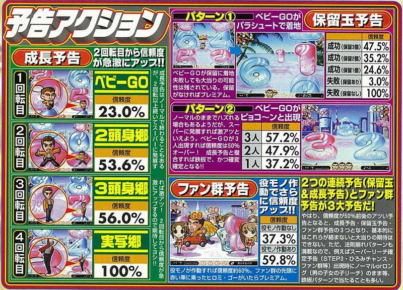 予告は比較的シンプルで保留変化とステップアップ、そして激アツの群予告とパチンコの定番ともいえる演出が中心。随所に出現するベビーGOがアニメキャラの可愛さを際立たせていました。