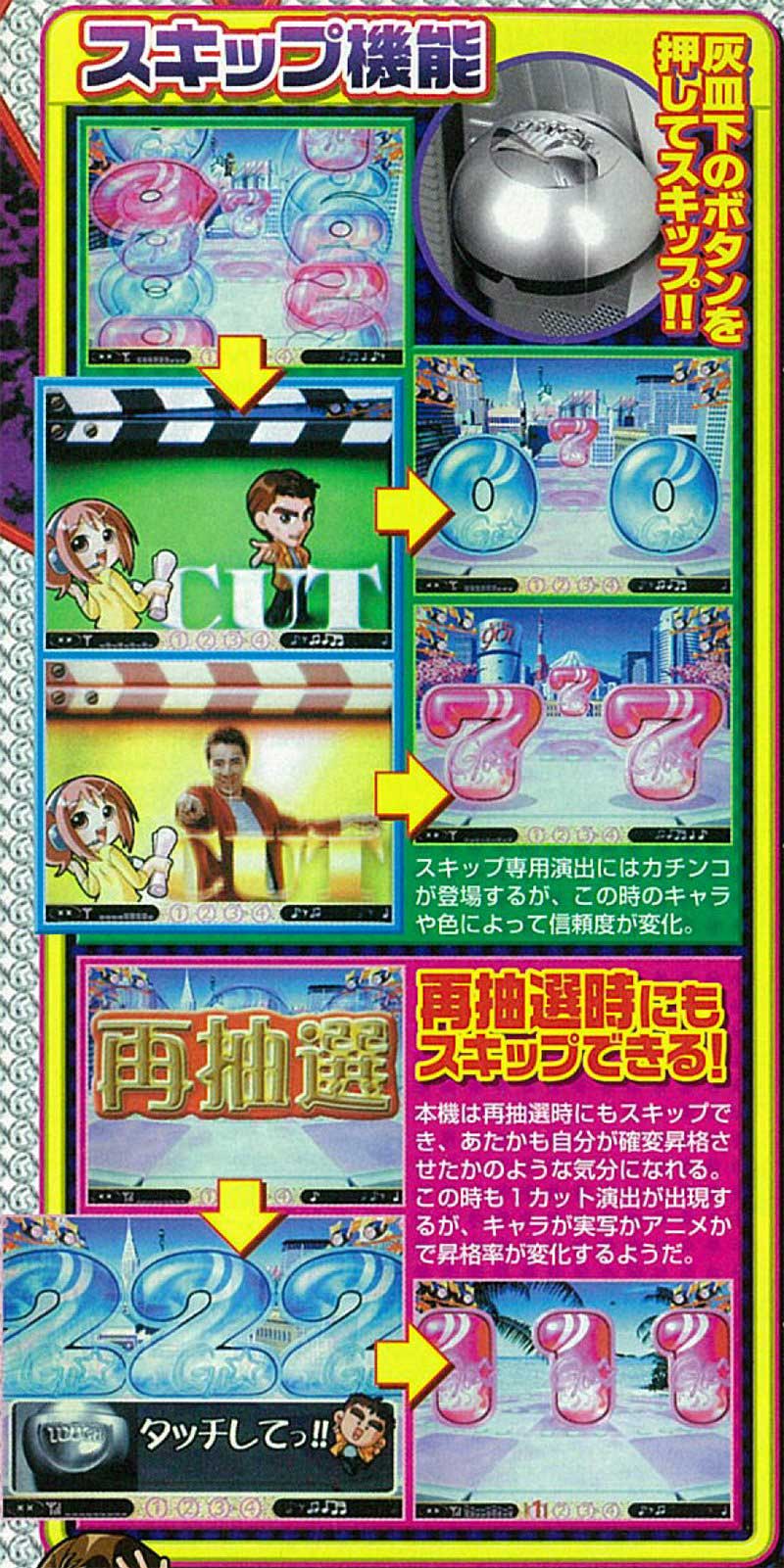 そして最注目なのが当時流行していたスキップ機能。これは変動中にボタン等に触れることで(本機の場合は筐体左下に搭載)、演出を最後までスキップ。一瞬でその変動の結果がわかるという機能でした(大当りの場合はリーチ等が出現せず即当たりする)。ちなみにスキップ時にも色変化などによるチャンスアップパターンも存在しました。