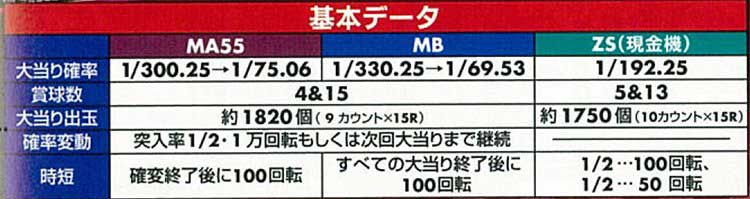 スペックは全3種類存在(ZSは現金機)し、メインとなるMBはミドルタイプ。確変突入率2分の1というおなじみのスペックで複雑なゲーム性は皆無。シンプルに演出と楽曲が楽しめるゲーム性となっていました。