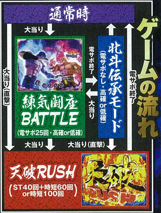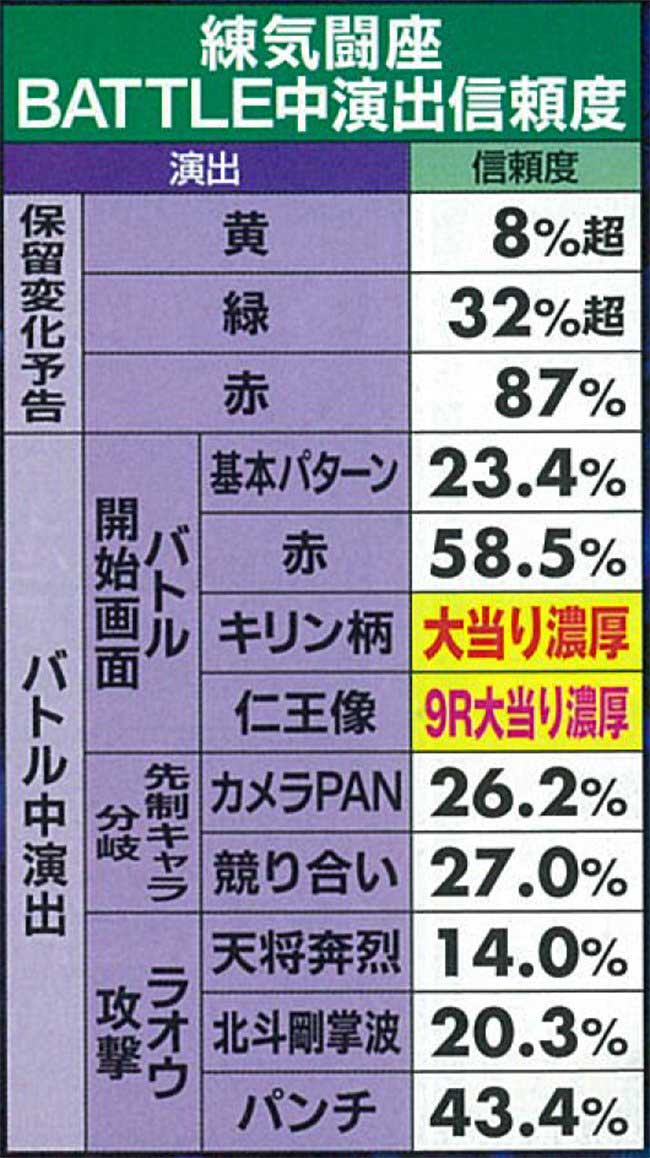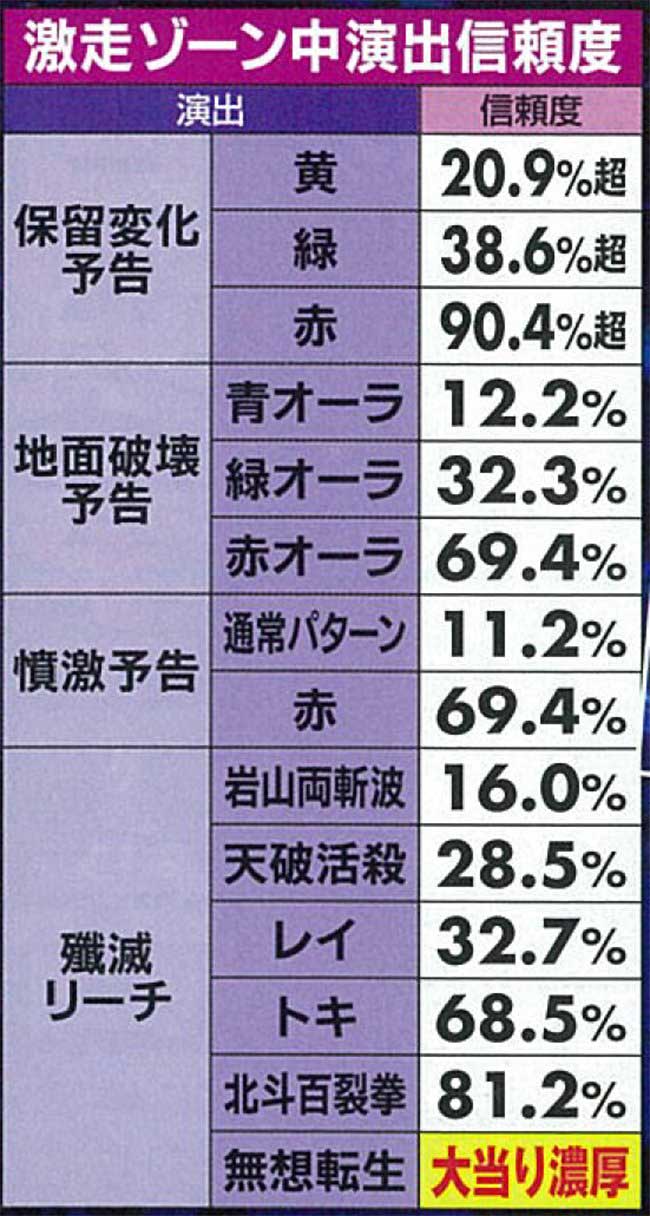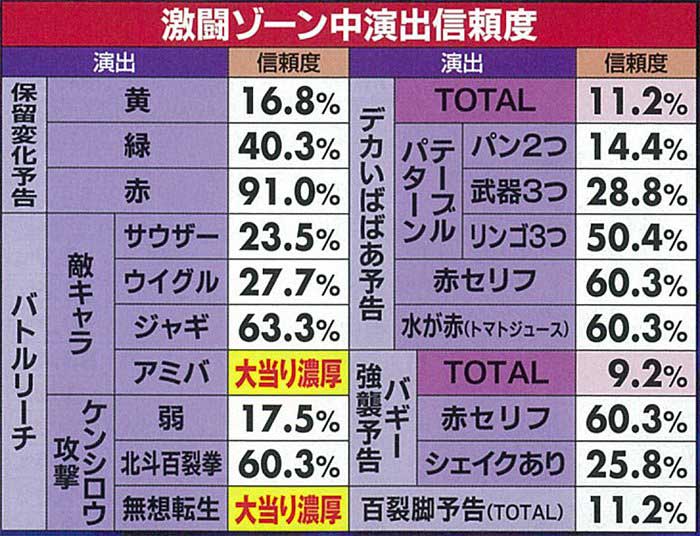 激闘ゾーンではバトルの相手とケンシロウの攻撃パターンで信頼度が激変する。予告は「赤」待ちが基本だ。