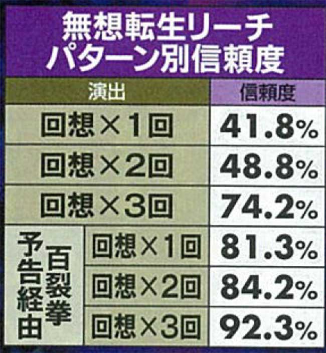予告は百裂拳予告、リーチはケンシロウvsラオウならどちらも信頼度約80%と激アツ! 他演出はチャンスアップや複合に期待しよう。