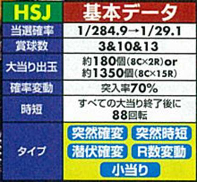 スペックは300分の1を切るミドルタイプと約200分の1のライトタイプの2機種で登場するのが本シリーズの基本。ゲーム性は突然確変・突然時短・潜伏確変を搭載しており、大当り後は確変or時短のチャンスタイムに突入する仕様となっています。