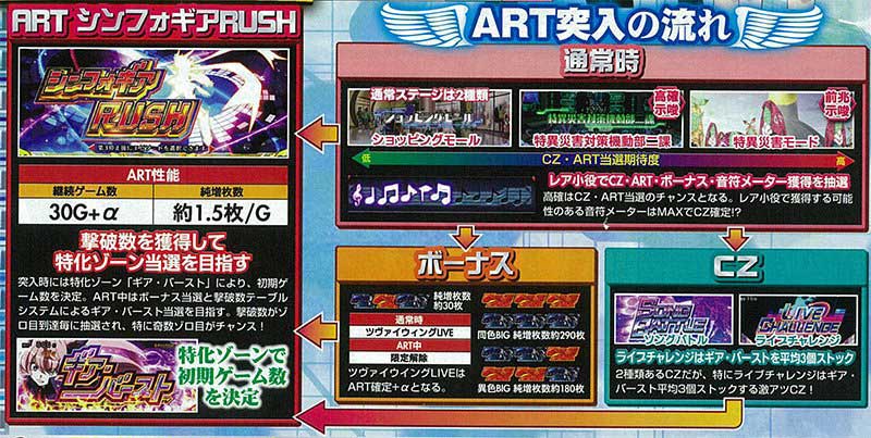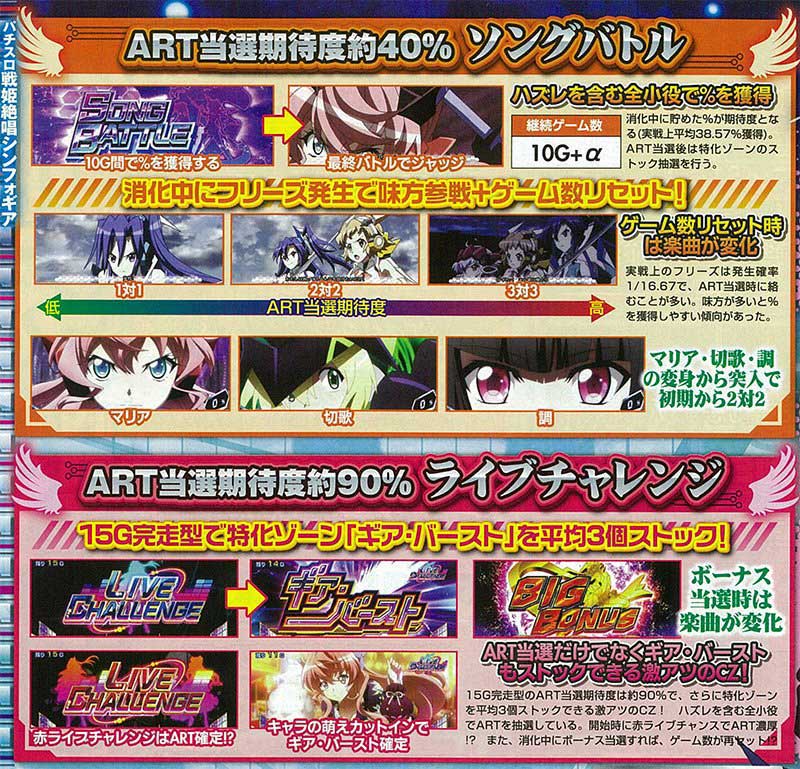 本機の面白さを心行くまで楽しめるのが2種類のCZ「ライブチャレンジ」と「ソングバトル」、そして出玉の要であるART「シンフォギアRUSH」です。
