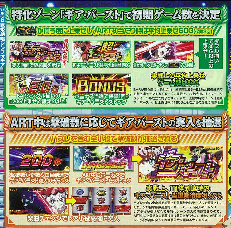 ARTは特化ゾーン「ギア・バースト」からスタート。ここで初期ゲーム数が決定されました(最低30G以上スタート)。またART中は「ギア・バースト」突入のカギとなる撃破数ポイントを抽選、これをテーブル管理する仕様でした。