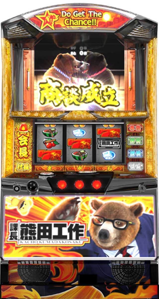 そんな2作を経て先日登場したのがシリーズスピンオフ的なマシンとなる「課長 熊田工作」です。本機は前述の通り、6.5号機のATタイプとなっており「出世回胴システム」を採用。出世するほどボーナスループ率がアップする仕組みで、最大約92%に!! ノーマルタイプな「熊酒場」とはまた違ったゲーム性となっていますが、熊が主役のシュールな世界観は健在。癒されつつも(!?)アツくなれる、そんな本機をホールでぜひ体験してみてください。