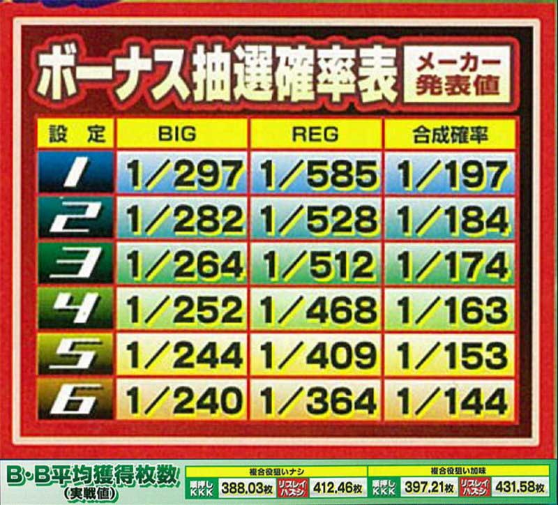 初代ではフル攻略することでBIG1回あたり約430枚の獲得が可能となっていました。またボーナス抽選確率にも当然差があり、同じ設定6でも6号機の方が当たりやすくなっています(合算確率1/136)。