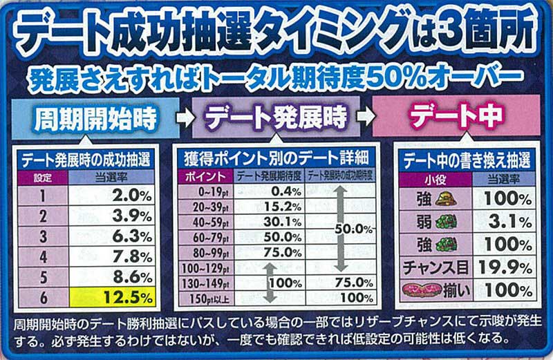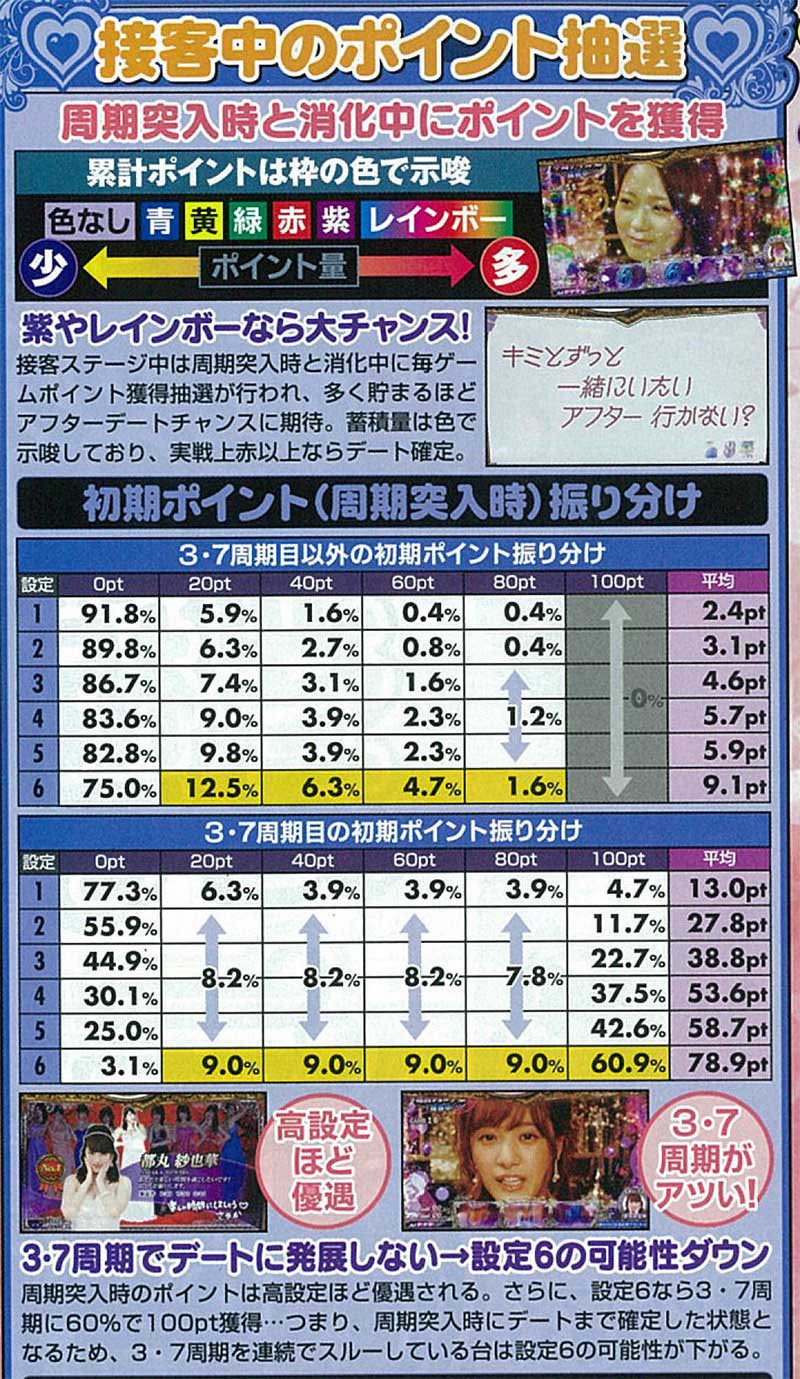 その接客ステージ中の詳細数値については上記の通り。チャンスとなる3周期目・7周期目は大きくポイント抽選が変化するので注意が必要だ。ちなみに12周期目に突入すればAT確定となる。