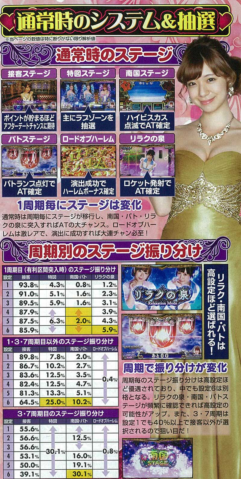 通常時には複数のステージが存在するが、基本は接客ステージからアフターデートチャンスへ突入し、そこからAT突入を狙うこととなる。