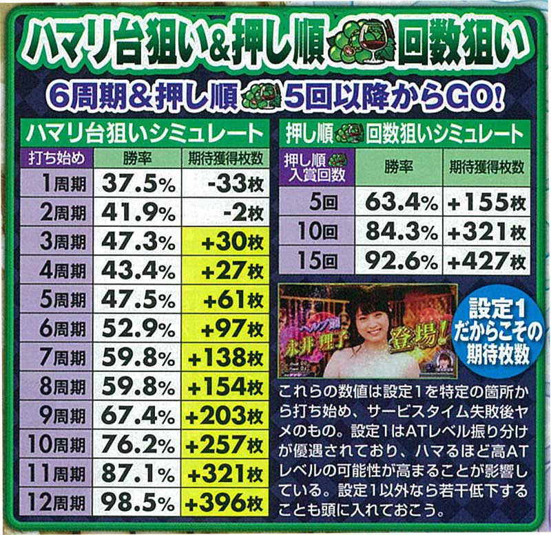 また共通ベルの確率にも設定差が存在し、設定1なら1/24.5、設定6なら1/19.7となる。ただし通常時は押し順ベルと区別がつかないため、カウントするならAT中のみ(AT中のナビなしベルが共通ベル)。