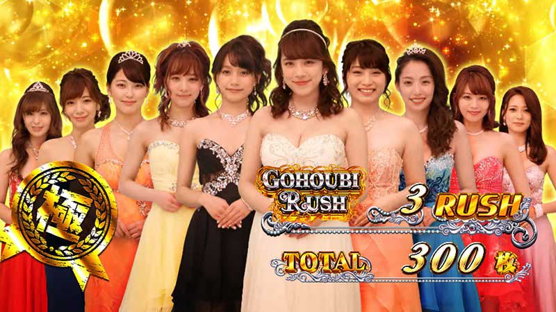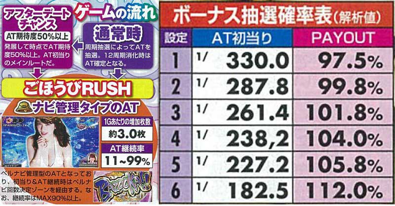 仕様は6号機のATタイプで、1Gあたり約3枚増加のAT「ごほうびRUSH」を搭載。ベルナビ管理型で、継続率はMAX90%オーバーを誇る。通常時は周期抽選からATを目指すこととなる。