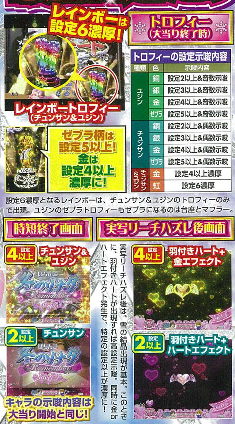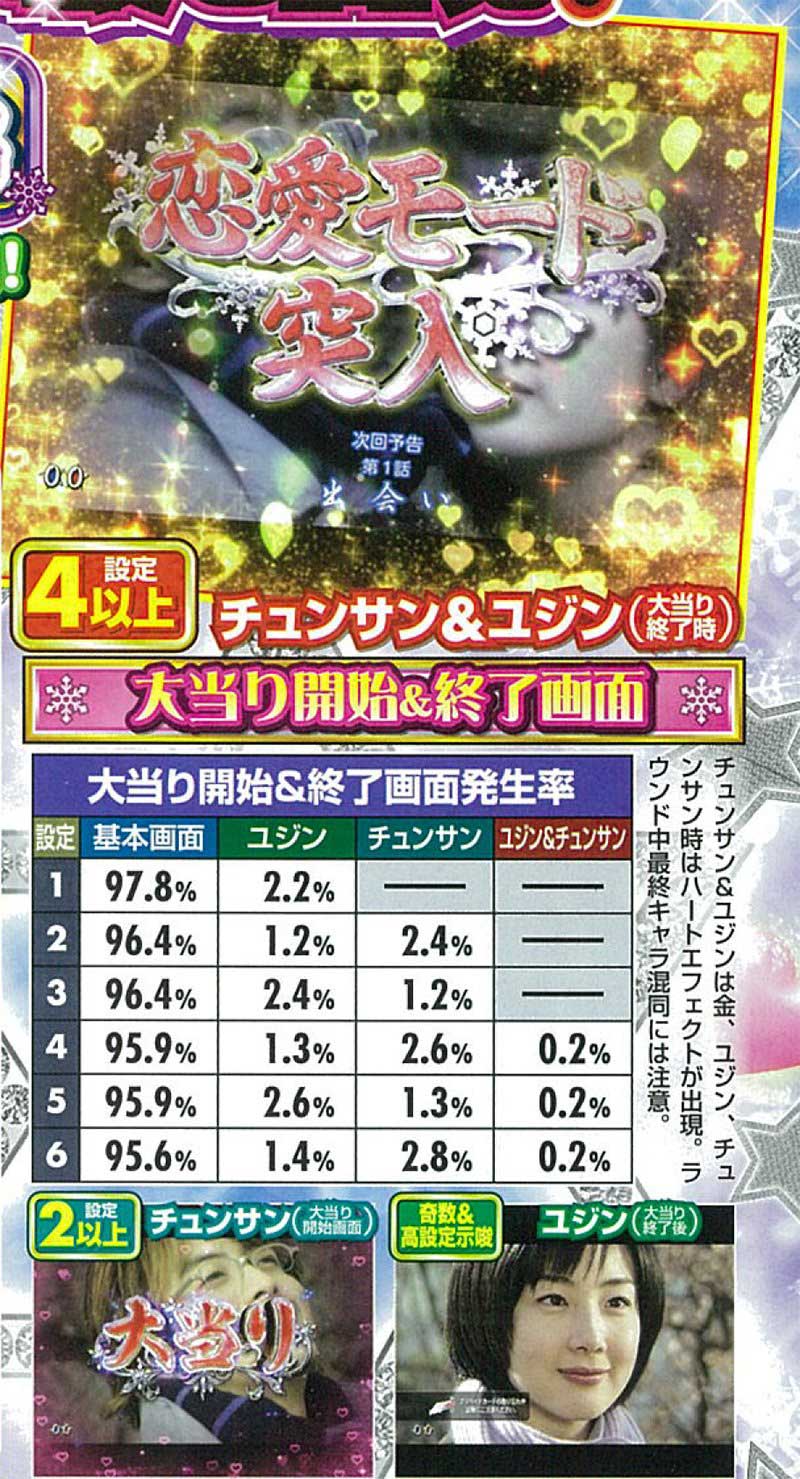 6段階の設定がついており、設定1と設定6では当選確率が大きく異なる。ゲームの流れは「冬ソナ」シリーズおなじみの仕様で、初打ちでも困ることなく遊べる親切設計となっている。
