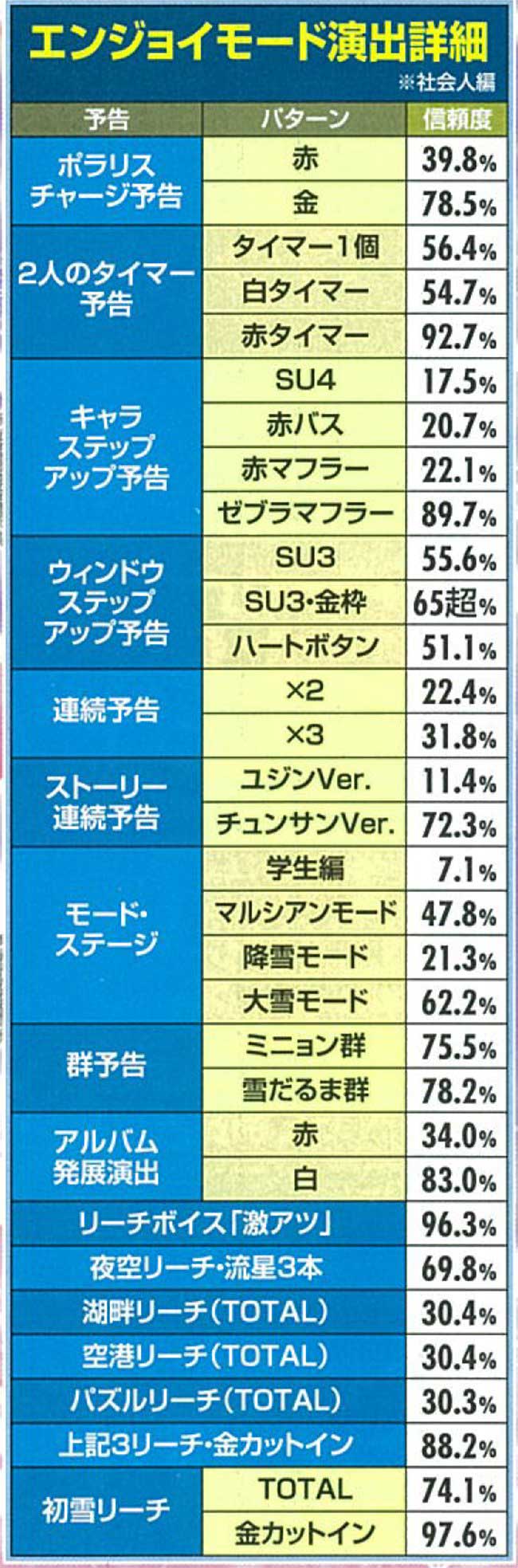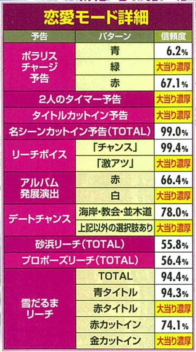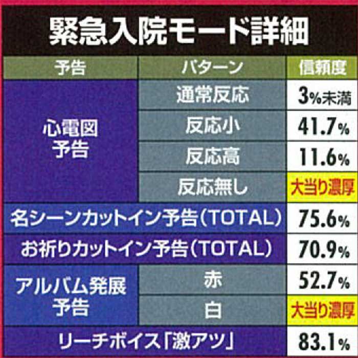 通常時(エンジョイモード選択時)、確変中(恋愛モード)、突確中(入院モード)の主要アクション信頼度に関しては上記をチェック。