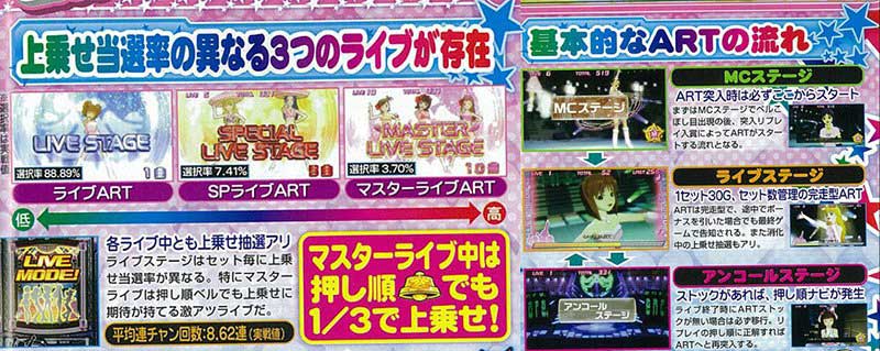 ART中は3段階にステージが変化していく展開で、上乗せ当選率の異なる3つのライブが存在。最上位の「マスターライブART」ならベルでも上乗せが期待できる激アツ演出となっていました。