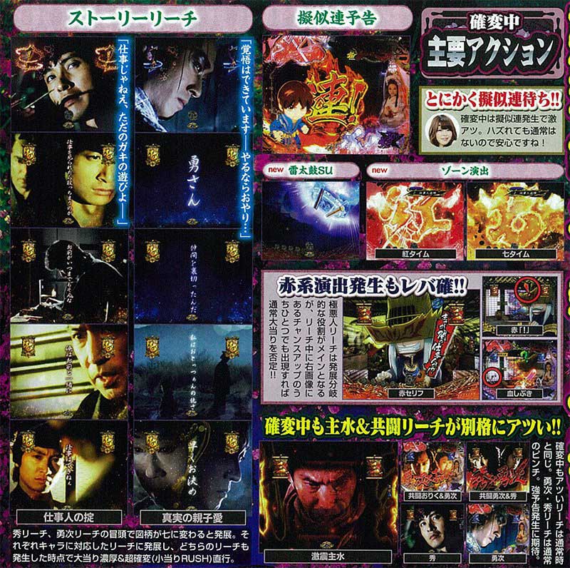 確変中には本機だけのオリジナルストーリーリーチが2種類存在。それぞれ秀リーチ・勇次リーチの冒頭で図柄が「七」に変化すると発展する。どちらのリーチも発展した時点で超確変直行の大当り濃厚だ!