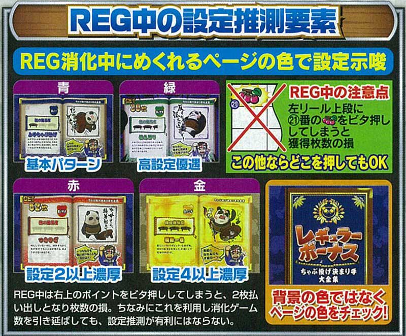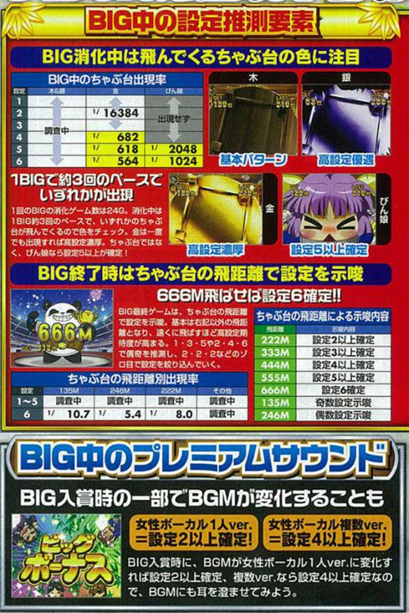 主にBIG中・REG中が設定看破のチャンスとなり、上記のような法則がありました。特に1BIG中に3回は訪れる「飛んでくるちゃぶ台」がポイントで、設定差が大きく、1回でも出現すれば高設定濃厚となる演出もありました。