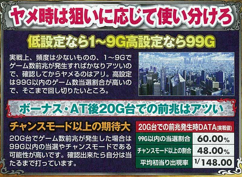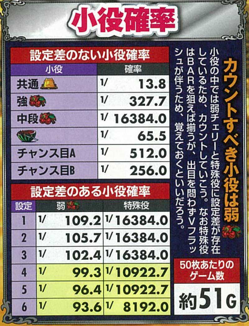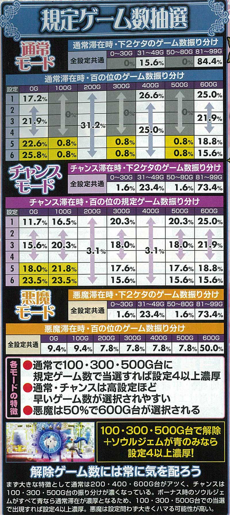 規定ゲーム数振り分けは通常モードよりもチャンスモード滞在時の方が設定差は大きい。チャンスモード滞在時は設定6なら47%が199Gまでに当たるということに。