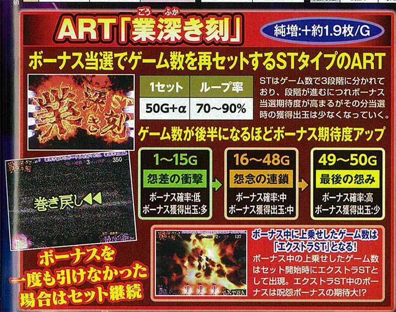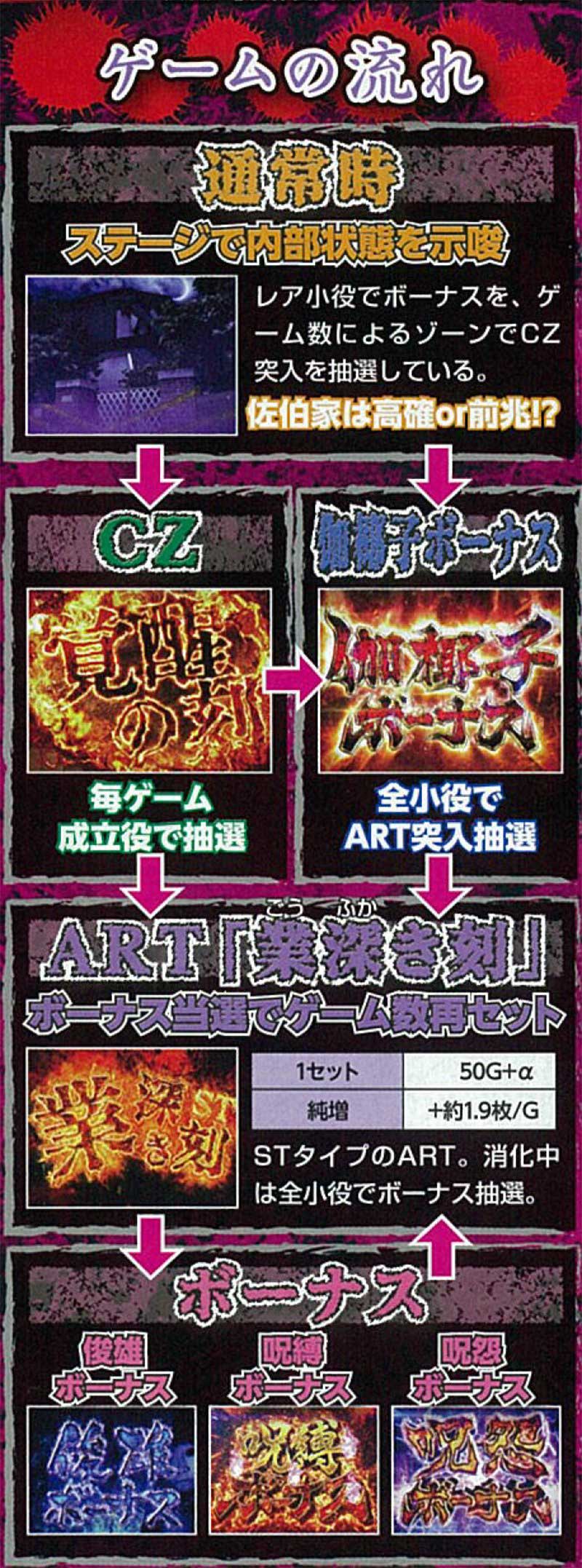 スペックはARTタイプでCZ「覚醒の刻」や「伽倻子ボーナス」から突入するART「業深き刻」が出玉獲得のメイン。このARTと各種ボーナスがループすることにより大量獲得も可能となっていました。