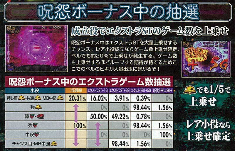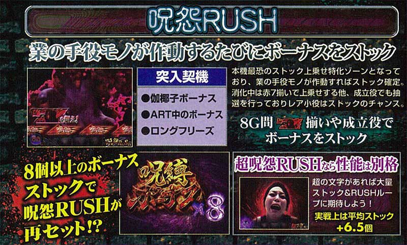 また通常時のロングフリーズなどから突入する本機最強の上乗せ特化ゾーン「呪怨RUSH」も本機の重要なポイント。業の手役モノが作動すればストック確定で、「超呪怨RUSH」なら一撃期待値は2000枚オーバーに!