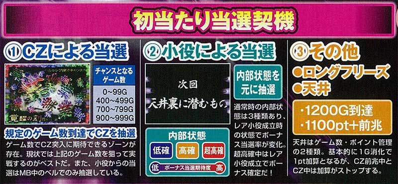 そんなARTへの突入契機は主に3つ。小役による当選や天井などの他に規定ゲーム数で突入するCZ「覚醒の刻」からの突入も期待できました。