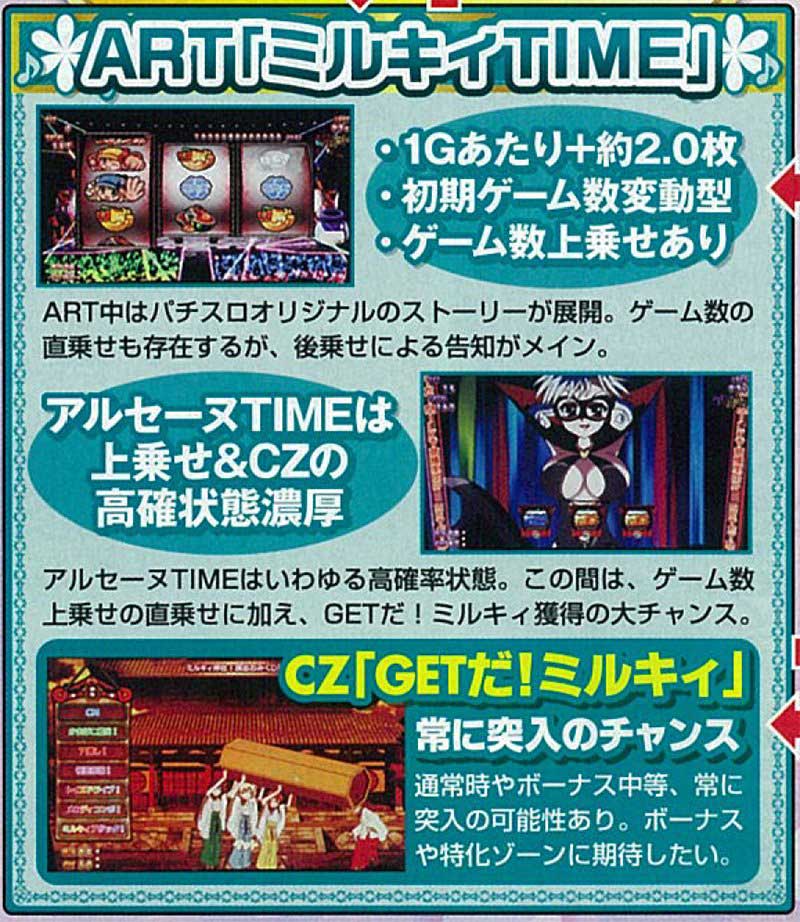 ゲーム性はARTタイプで2種類の擬似ボーナスを搭載。原作を彷彿させる演出群と歌にあわせて発生する上乗せという特徴を持ち、アニメファン以外からも支持を得た機種でした。