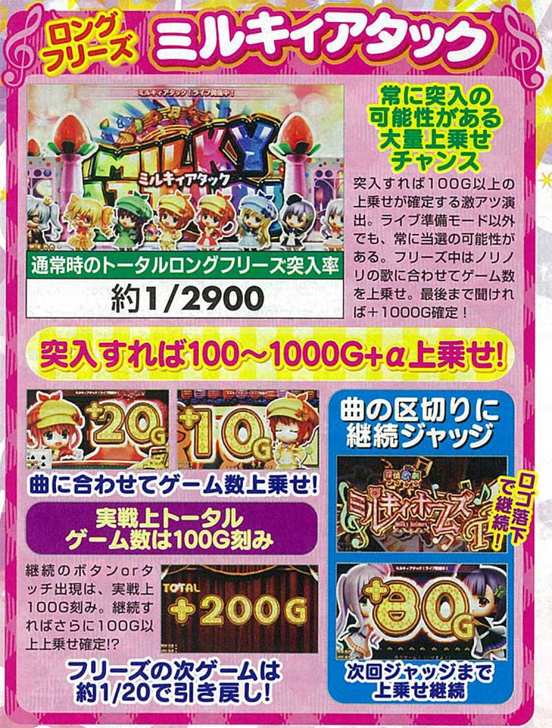 また本機最大の上乗せチャンスとなっているのがロングフリーズ「ミルキィアタック」。フリーズ中は歌に合わせてゲーム数を上乗せ。一旦突入すれば100Gから最大1000Gの上乗せも期待でき、大量獲得の好機となりました。