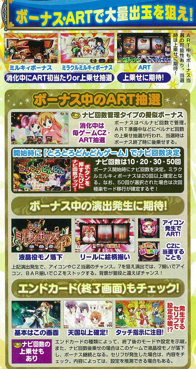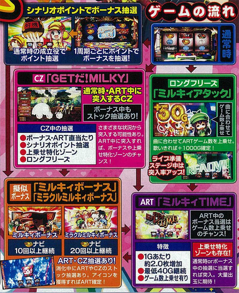 擬似ボーナスである「ミルキィボーナス」「ミラクルミルキィボーナス」は、どちらも重要なART突入契機に。ボーナス消化中にアイコンを獲得すればART確定となりました。「ミラクルミルキィボーナス」中ならアイコン獲得率もアップ!