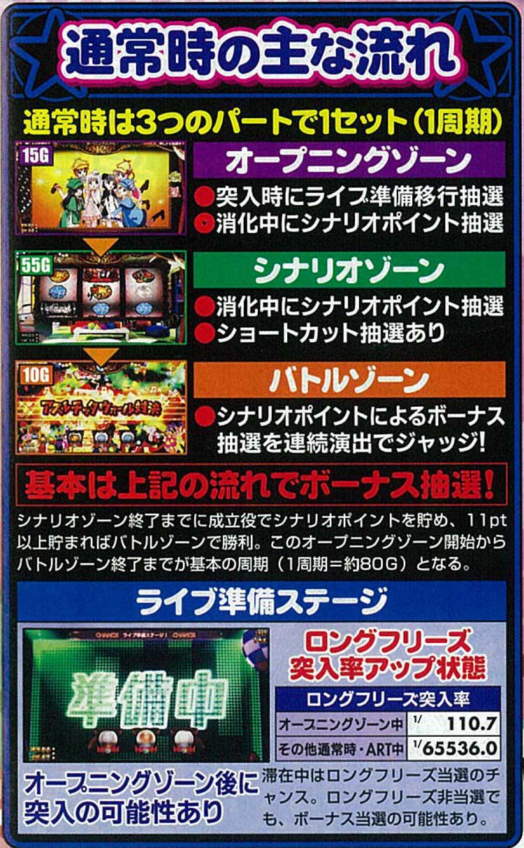 またその突入契機の1つである通常時は3つのパートが1セットとなっており、各パートでポイントを獲得、最終パートであるバトルゾーンで勝利すればボーナスorART当選となりました。また稀に突入するライブ準備ステージでは、大量獲得の契機となるロングフリーズ高確率状態に! これらの周期を繰り返すのが通常時の主な流れとなっていました。