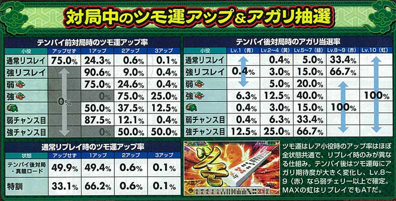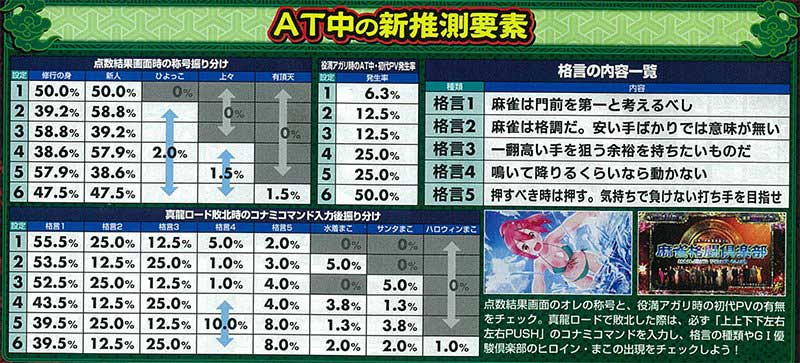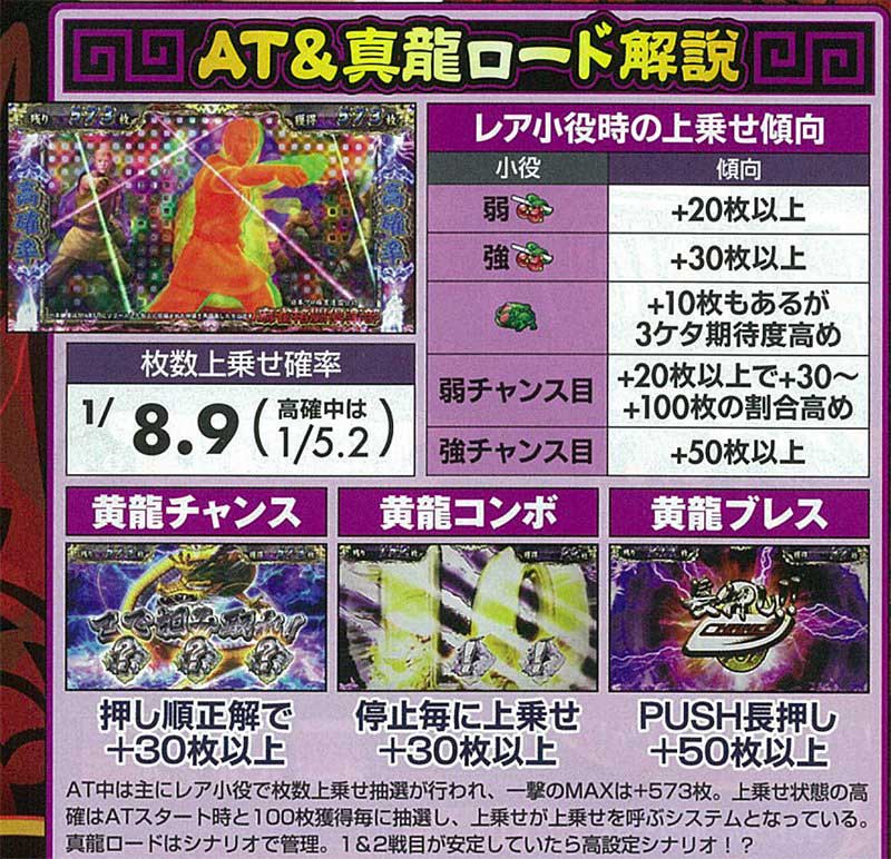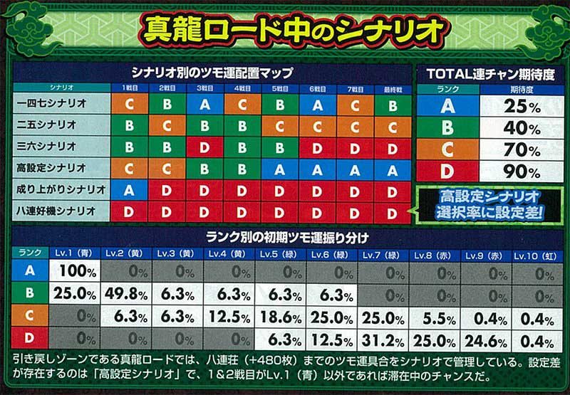 AT終了後に突入する真龍ロードはシナリオ管理となっており、そのシナリオからも設定推測が可能。八連荘(8連勝)を達成すればリアルの麻雀同様、役満扱いとなり初期枚数480枚のRUSHへと突入するぞ。
