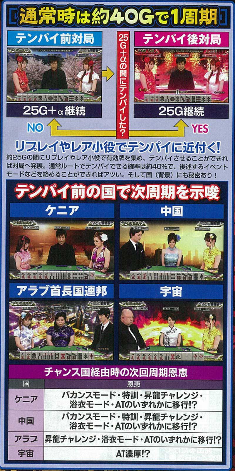 基本的に通常時に麻雀に上がればAT「格闘倶楽部RUSH」突入となる。また約40Gで1周期となっており途中イベントモードへ移行したり、特定の国(背景)に変化すれば期待度がアップする。