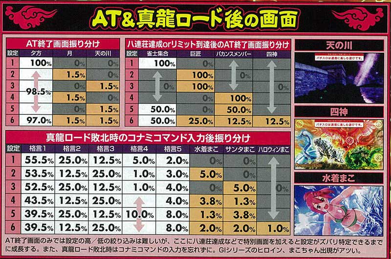 本機の主な設定推測要素は上記の通りで、AT中~真龍ロード終了までにそのタイミングが集中。
