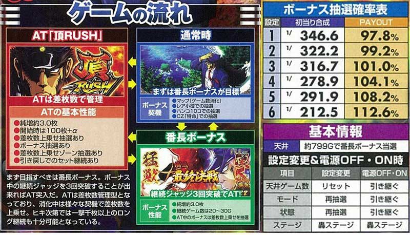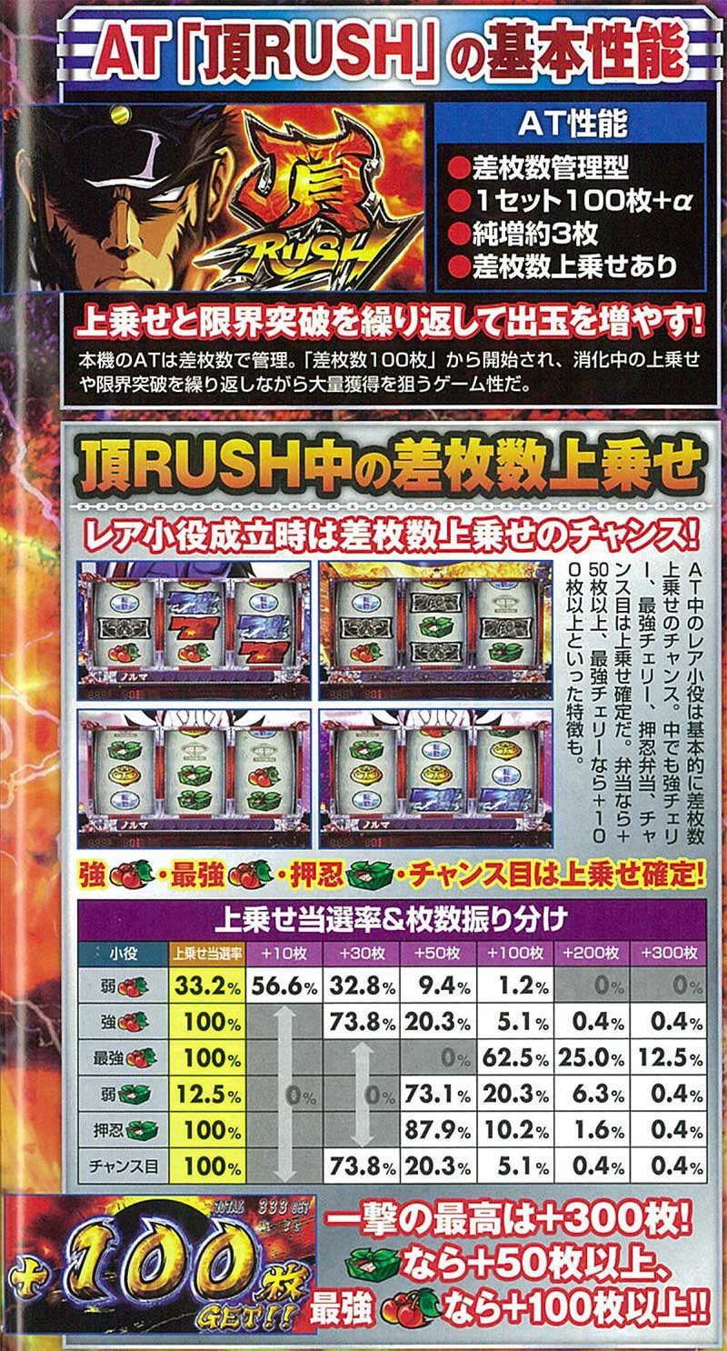 基本的には通常時からボーナスを経由しAT「頂RUSH」を目指すゲーム性。ATの1Gあたりの純増枚数は3.0枚で、消化中は様々な契機で差枚数が上乗せされていく。一撃の威力も高く、大量出玉もしっかり狙える仕様だ。