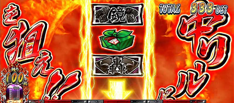 頂RUSH中は、強or最強チェリー・押忍弁当・チャンス目当選で上乗せ確定。また上乗せ当選時の枚数にも特徴があり、強チェリー・チャンス目なら+30枚以上、弁当なら+50枚以上、最強チェリーなら+100枚以上となる。