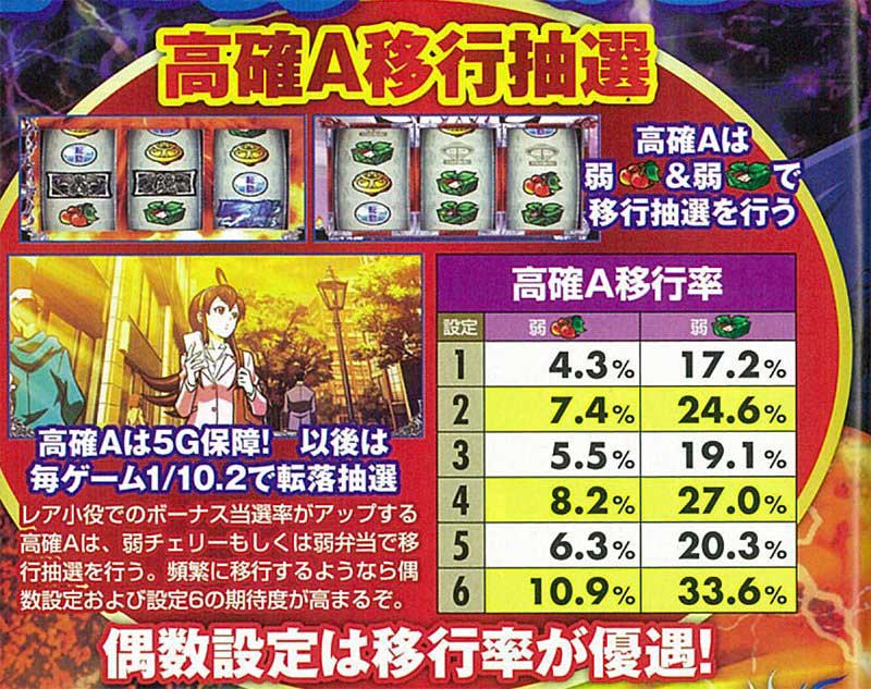 高確Aへは弱チェリーと弁当で移行抽選が発生。全体的には偶数設定が優遇されている。