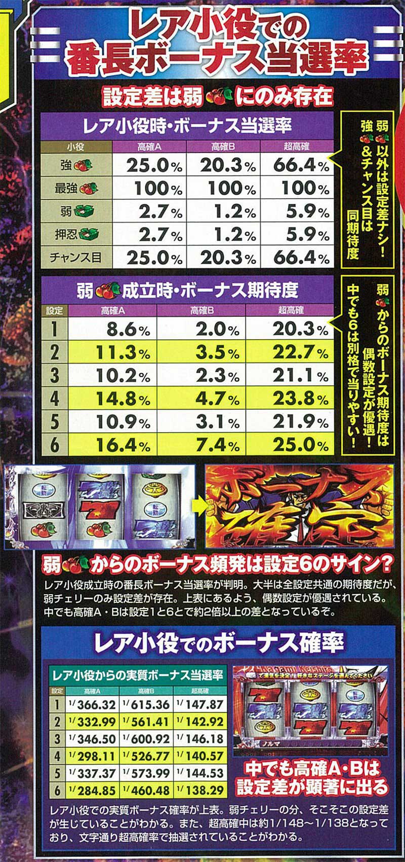 また弱チェリーからの番長ボーナス当選率についても設定差が存在し、ボーナスに繋がる弱チェリーが頻発すれば設定6の可能性が高まっていく。ちなみに通常時のレア小役確率は全設定共通で弱チェリー…約100分の1、弱弁当…約118分の1となっている。