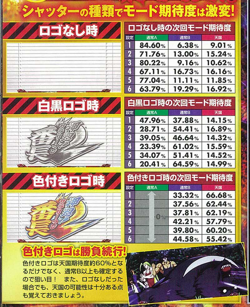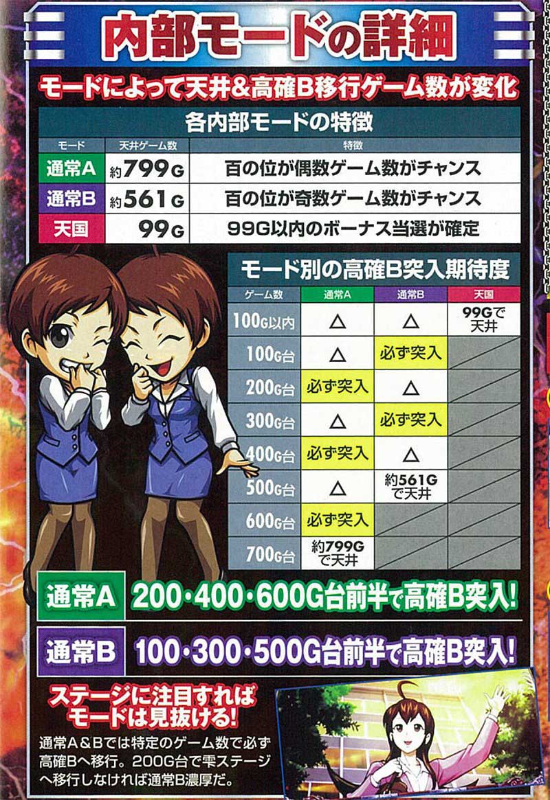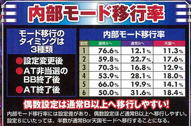 内部モードは通常A・通常B・天国の3種類が存在。さらに各モード移行抽選を行うのは、設定変更後・AT非当選のBB終了後・AT終了後の3つとなっている。